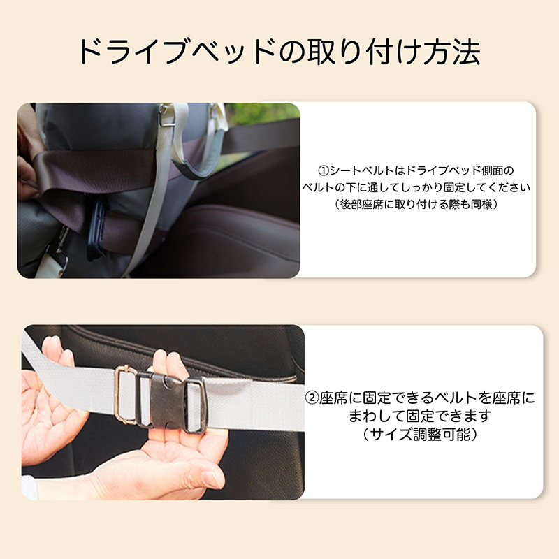 後部座席、助手席にも取り付け可能です。シートベルトを使用してシートにしっかりと固定し、ショルダーベルトをヘッドレストに掛けて固定します。