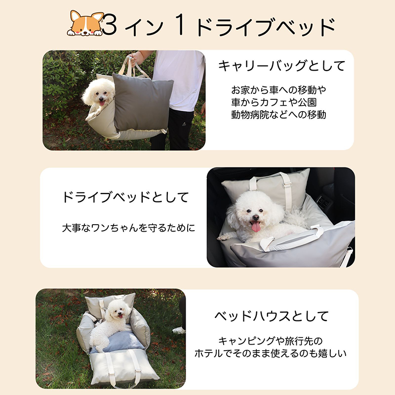 ペット用キャリーバック、ドライブベッド、ベッドハウス等1個で3通りの使用方法がございます。
