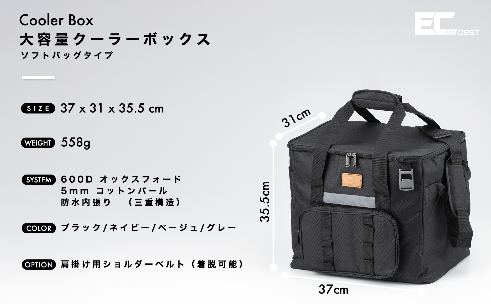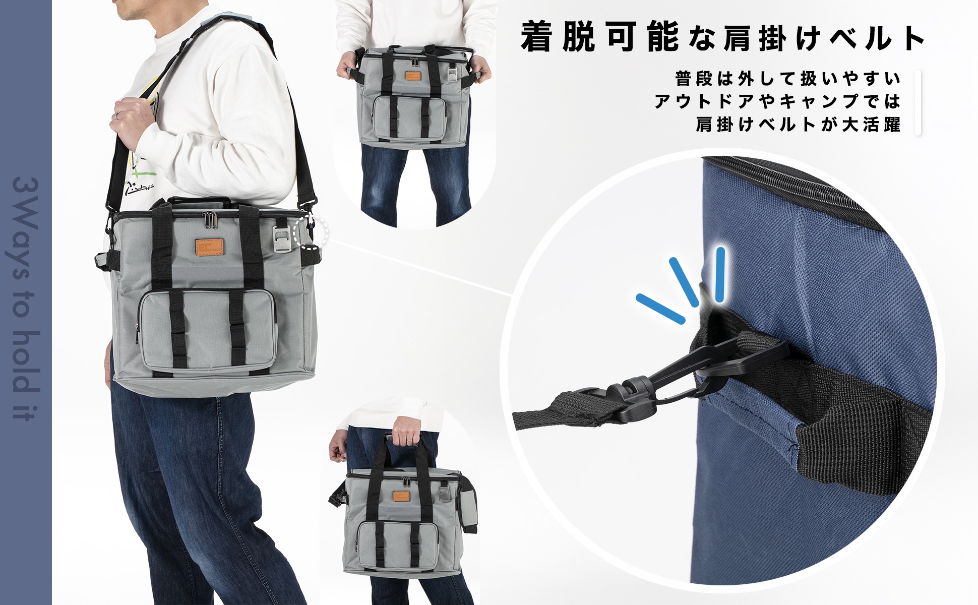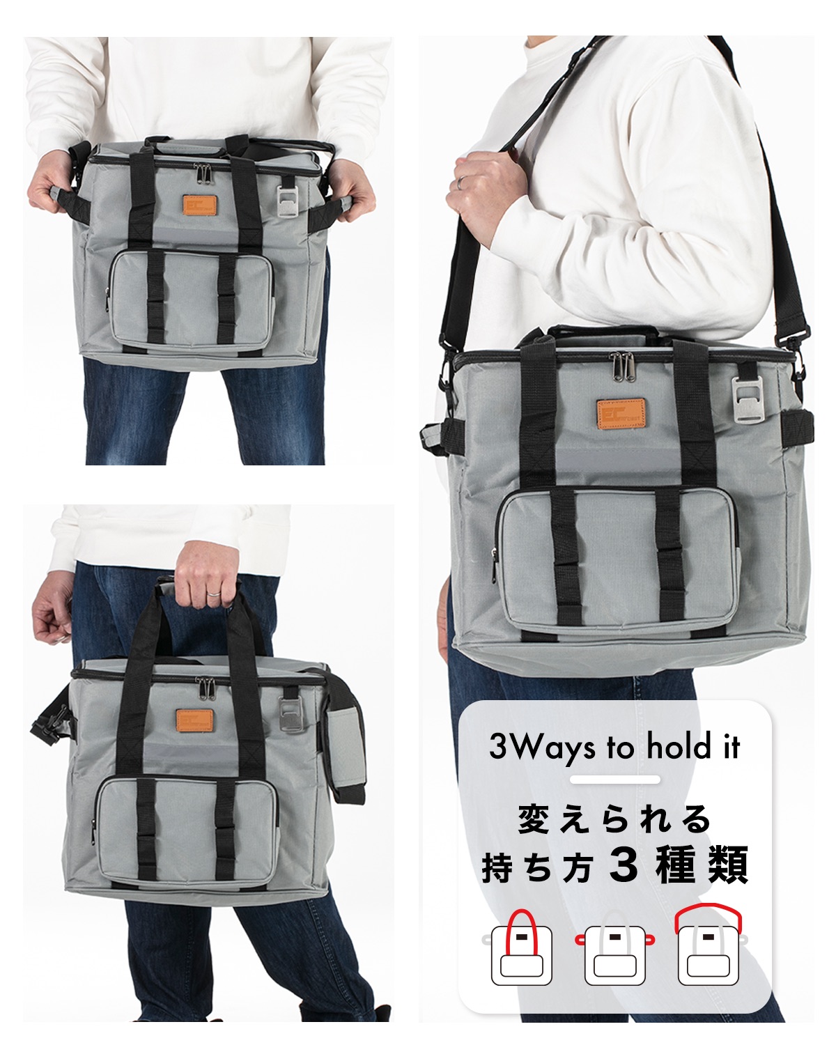 【3WAY仕様、おりたたみ収納可能なクーラーボックス】荷物の量によって、手持ちや肩かけや二人持ち3つのタイプから持ち方を選べる3way仕様になります。また付属のショルダーストラップは取り外しや長さの調整が可能になっていて、さらにショルダーパッドも付いたことにより、ショルダーストラップの食い込みを軽減、肩からのずれ落ちを防げます。またプラスチックなどの固めの素材で作られたハードクーラーボックスとは違い、使わないときにはコンパクトに折りたためるので、場所に困らなくちょっとした隙間に入れて保管が出来ます。ハードタイプのクーラーボックスより軽くてかさばらないので持ち運びやすいです。