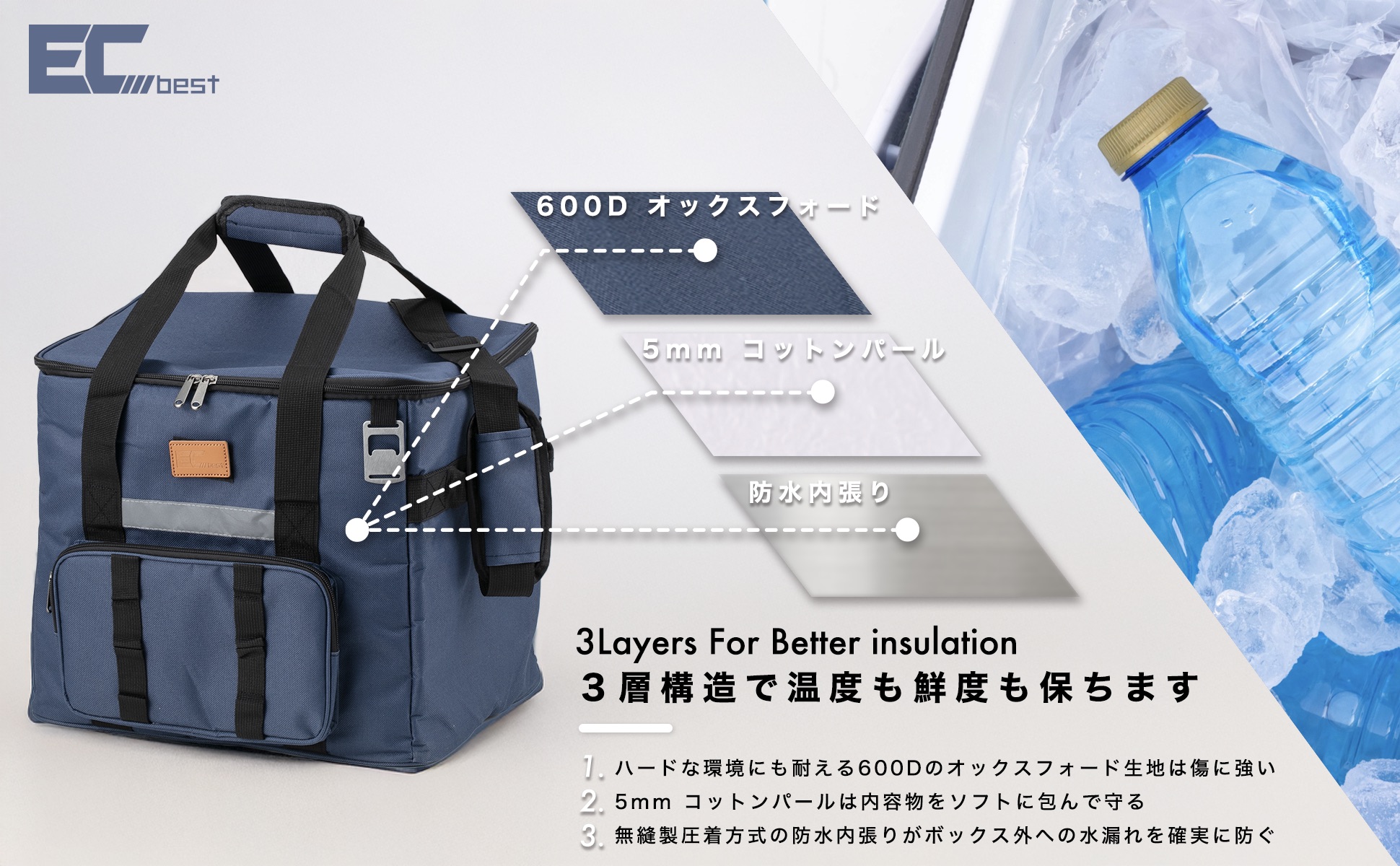 【3層構造によって高い保冷保温を備えているソフトクーラーボックス】本製品は600Dオックスフォードの生地を使用しており、防水に優れ、摩耗や引き裂き、擦れに強い仕様になります。中間層は厚手のパール綿を採用し、内側は高品質の厚めの保冷保温機能のある抗菌PEVA素材を採用し、全部で3層構造になっており、外部の熱を効果的に遮断し、長時間内部の温度を維持することができて、複数の素材を組み合わせて作られているため高い保冷保温力を発揮します。保温の目安時間は4時間。保冷の目安時間は6時間。保鮮度の目安時間は8時間。