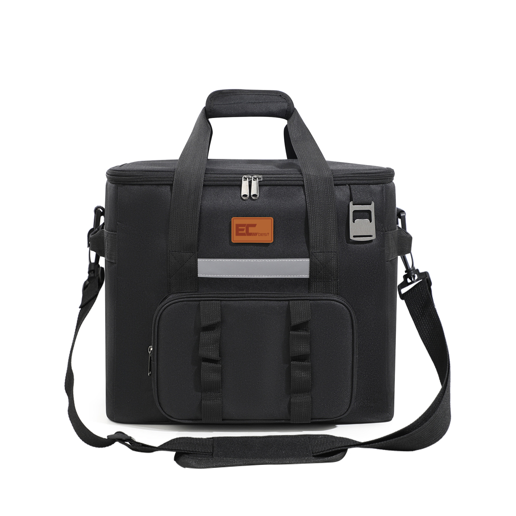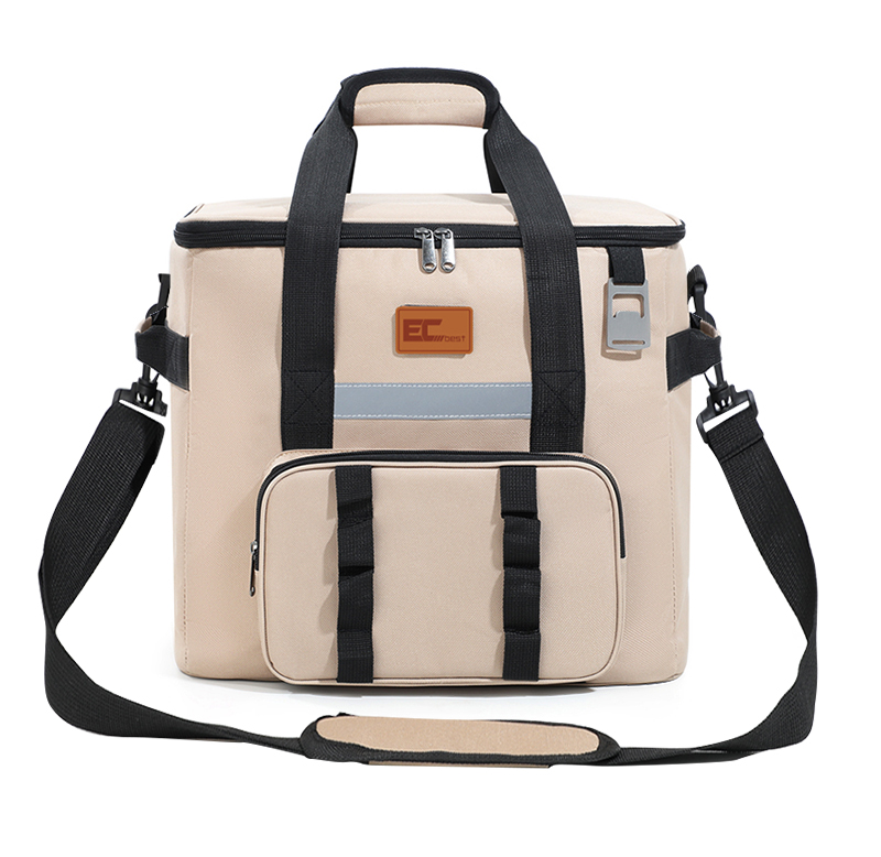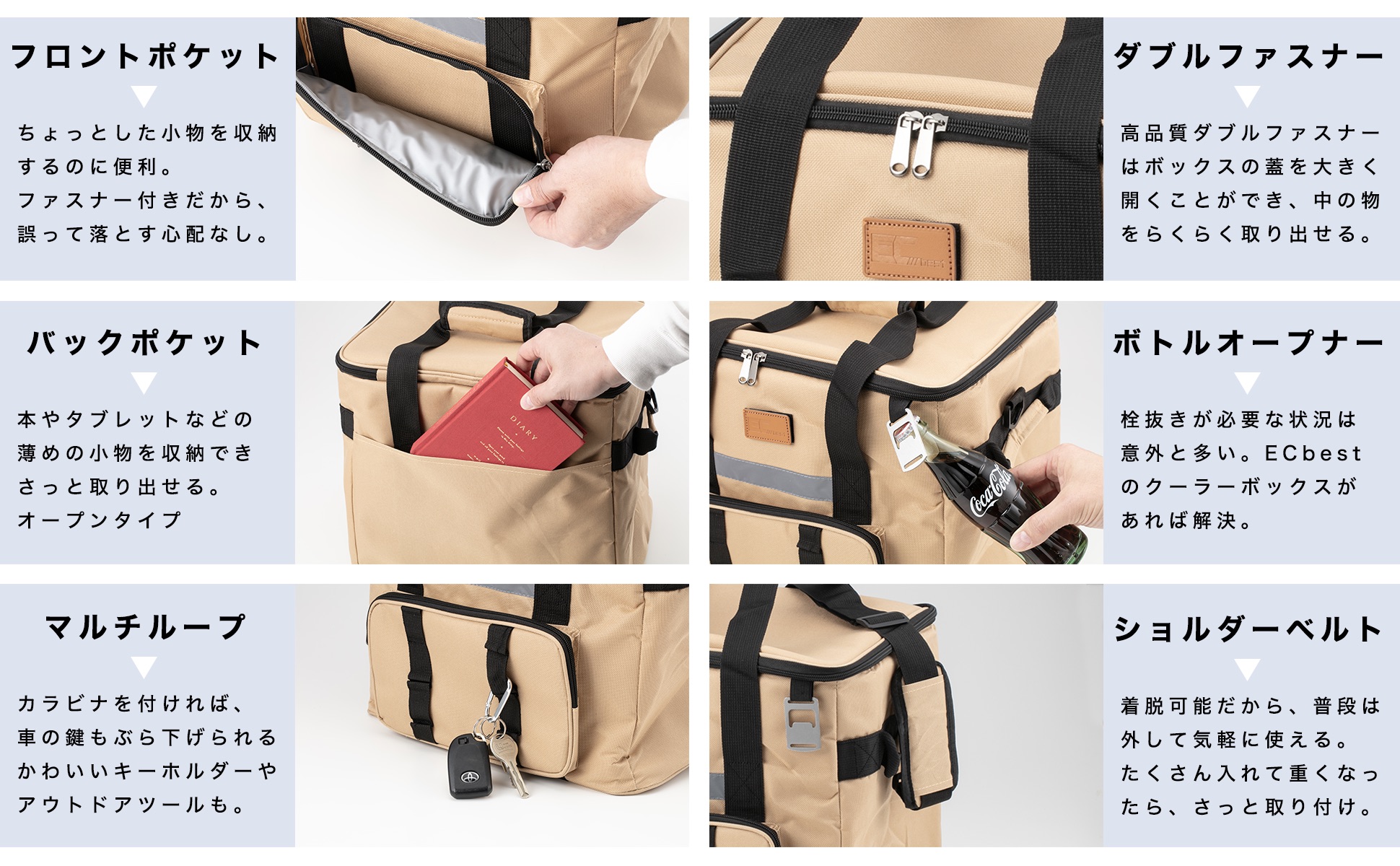 【魅力的な機能がいっぱいのソフトクーラーボックス】本製品の正面ポケットに輪っかのようなナイロンベルトが配置したことで、シェラカップの柄を引っ掛けたっとり、鍵や小型ライトやおもちゃなどの小物類を掛ける事も可能です。また特徴的に瓶オープンナーが付いており、瓶ジュースや瓶ビールを簡単に開くことが可能です。裏側に大きめの隠しポケットも作られており、iPadや本などの収納することも可能です。また正面に反射素材が付いており、夜のご利用も安心です。