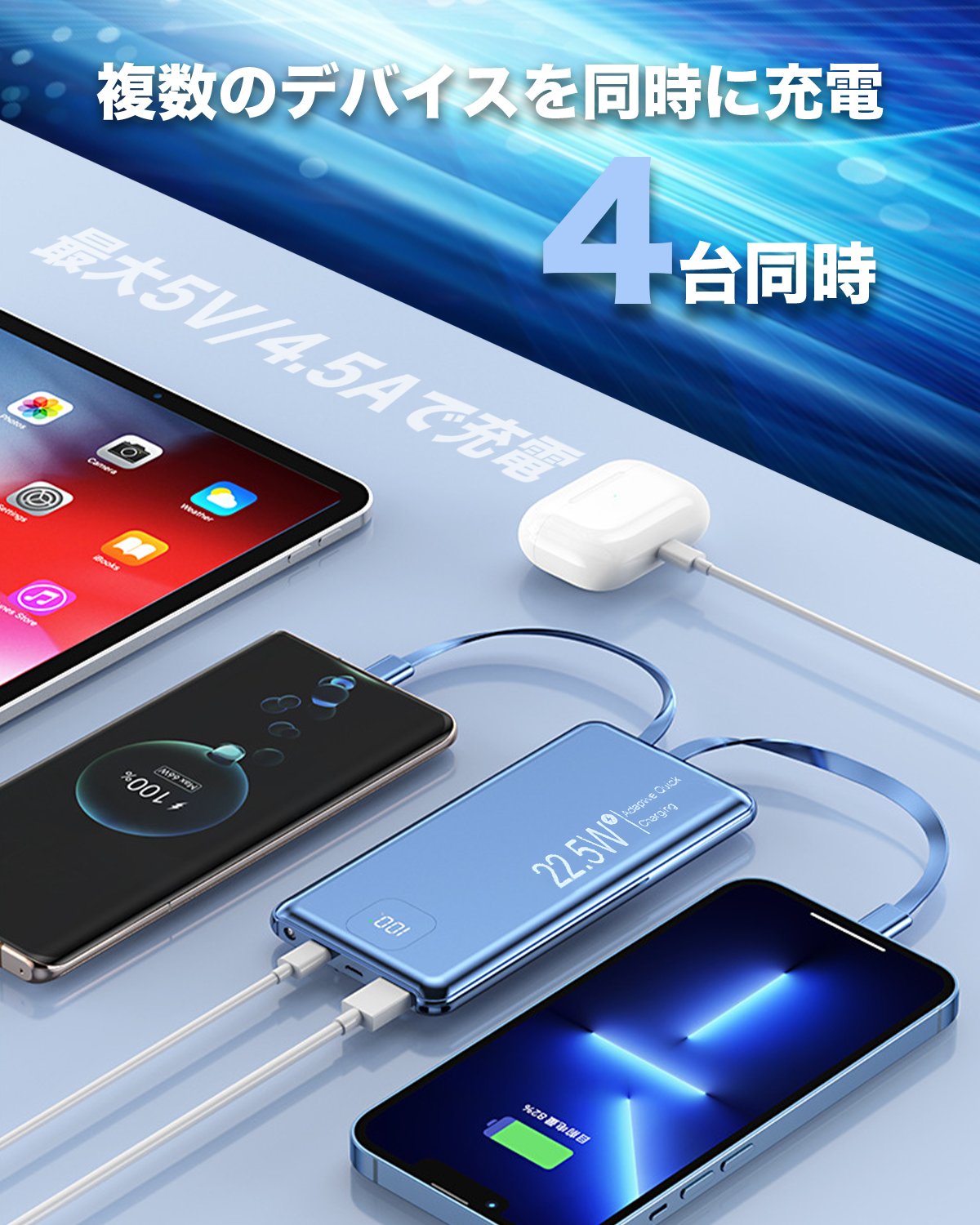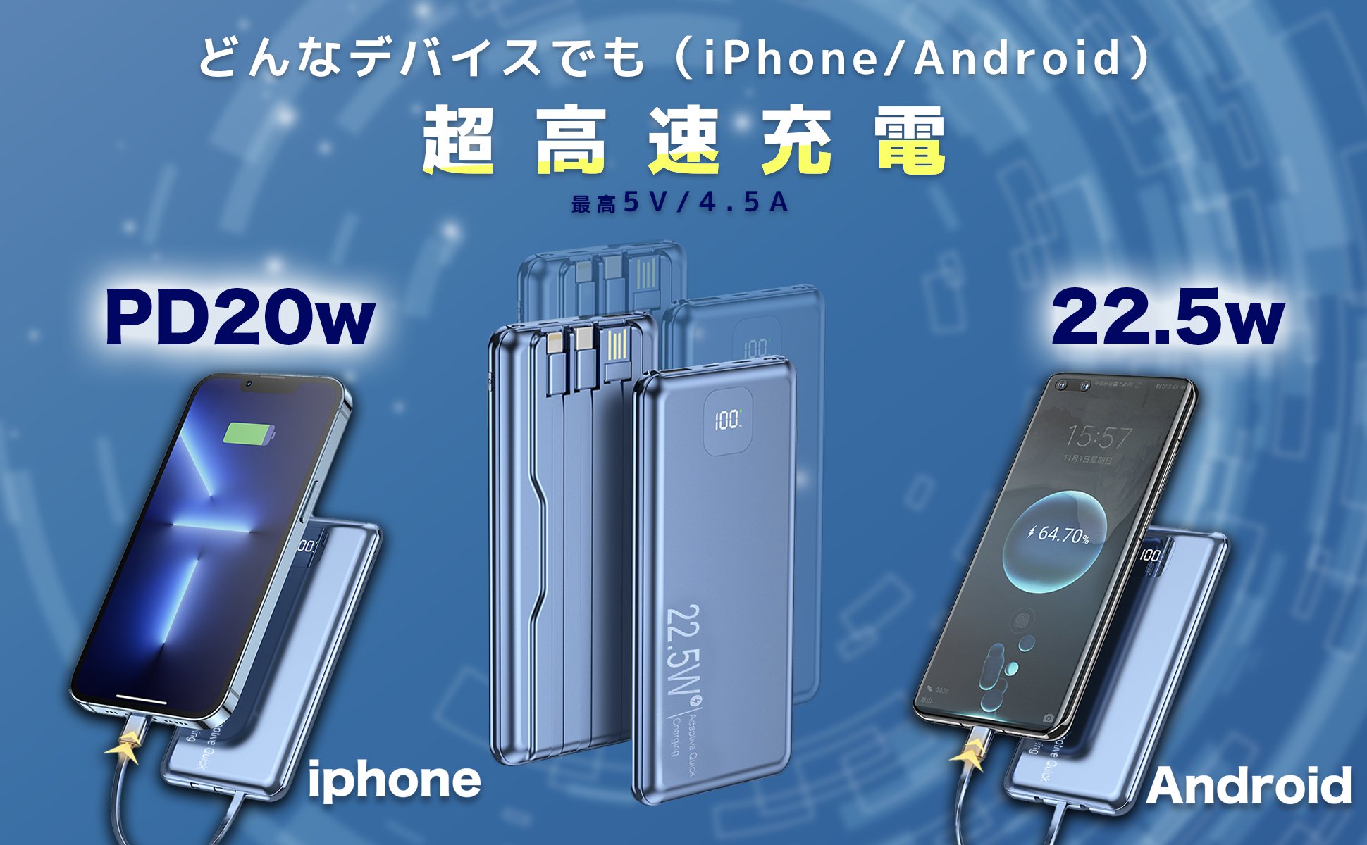 弊社製品はすべてアメリカのQualcomm社が開発した、スマートフォンやタブレットを急速で充電できるシステムを採用、Quick Chargeに対応したスマートフォンであれば、普通のモバイルバッテリー1.0Aと通常の急速充電2.0Aやと比較しても遥かに早い、ご利用のデバイスにより最大5V/4.5Aで充電が可能です。最大5V/4.5Aで急速充電可能USB-A出力ポートと最大出力5V/4.5A Type-Cケーブルを搭載することで、通常の5W出力に比べ4倍以上の速度で充電することができ、iPhone12の場合わずか40分で86%まで充電可能で、Huawei Mate40の場合は30分で65%まで充電する事ができます。PD18WのUSBケーブルが内蔵するため、本体への急速充電することもできます。