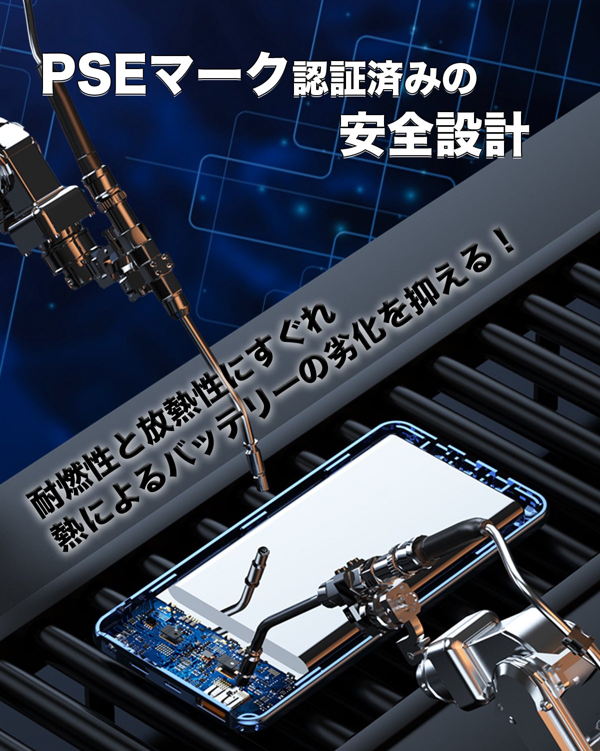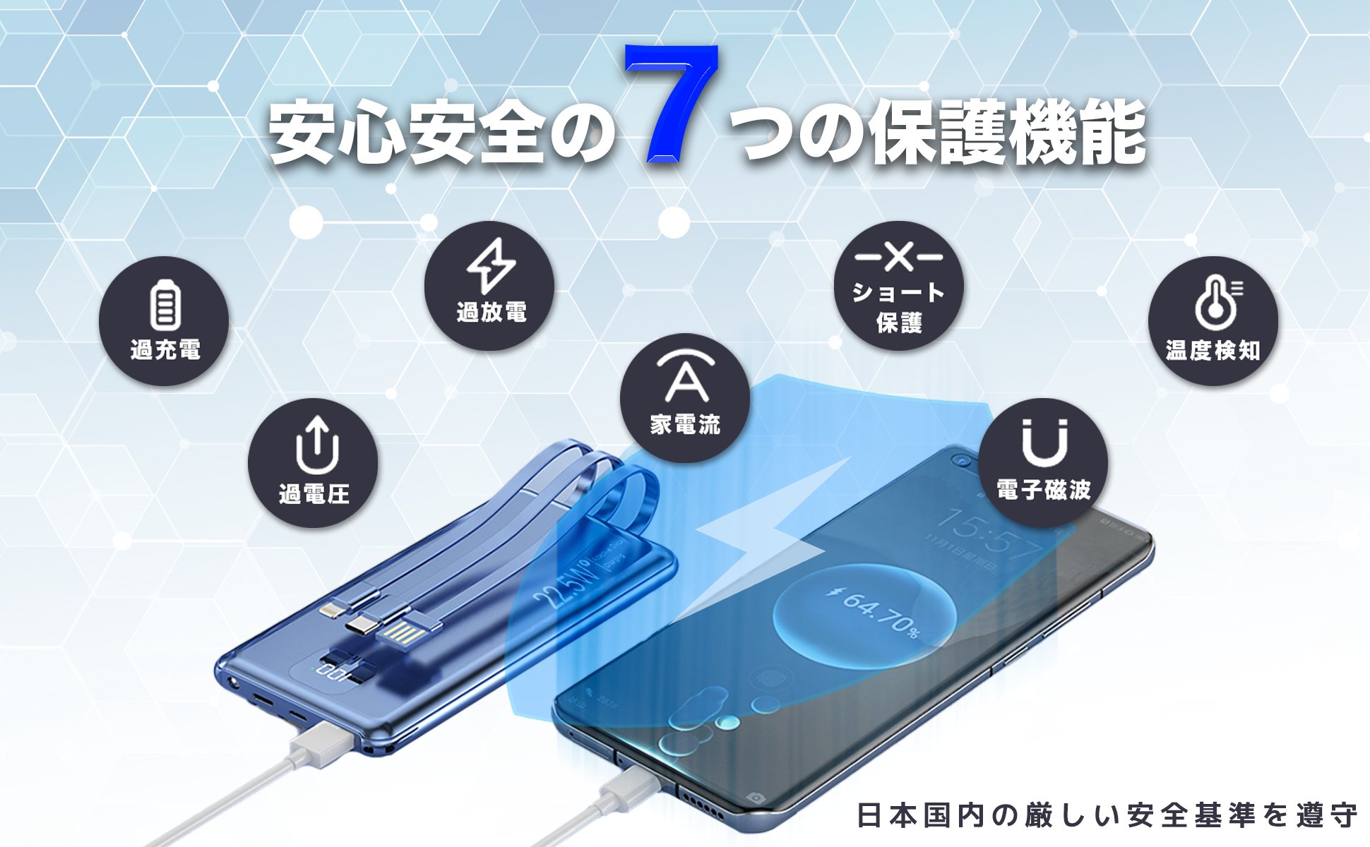 本製品は日本国内のJIS C 62133-2の基準をクリアした認証済の商品になります。長期間安心、安全にご使用いただけます。 過充電・過放電・過電圧・過電流防止機能およびショート保護機能と温度検知機能、電子磁波保護の7つの保護機能など安心の回路設計を備えました。モバイルバッテリー本体の熱発生を抑えて、熱伝導をしにくくする発熱抑制システム、充放電中に危険な状態にならないよう充電ポートSmart ICが内蔵されており、充電が完了したら自動でストップ、電池の過充電を防止、スマホバッテリー寿命を長持ちさせることができます。本製品もUN38.3(国連勧告輸送試験)合格品で、機内持ち込みすることも可能です。(航空会社によって規制の内容が異なる場合があります。)