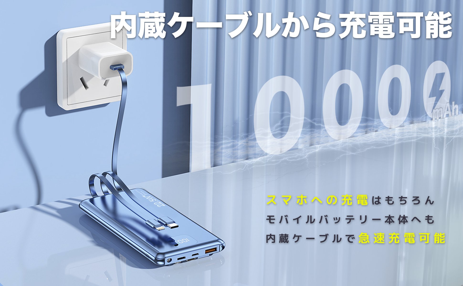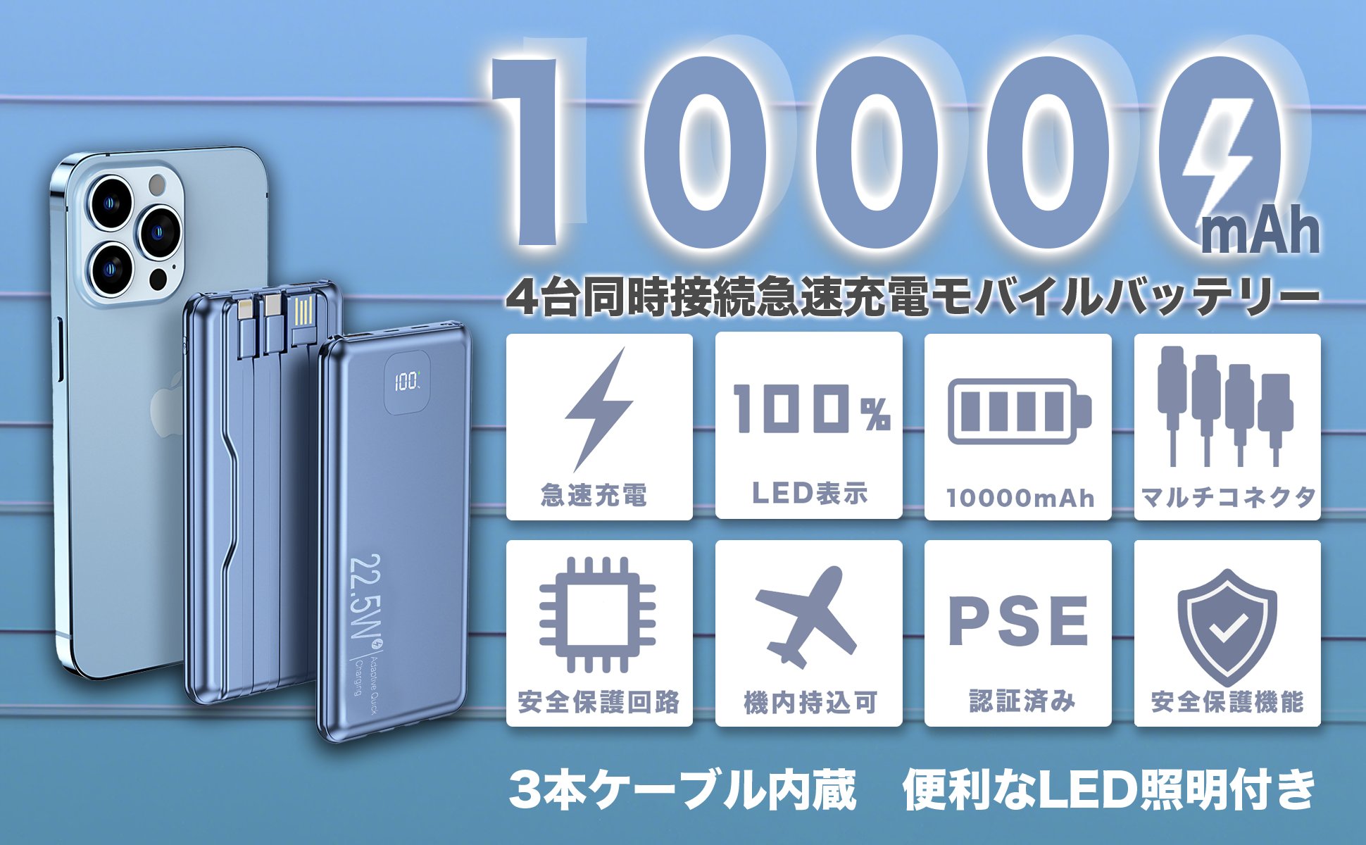 モバイルバッテリー 大容量 PD QC 急速充電 真10,000mAh PL保険付き 3本ケーブル内蔵 4台同時充電 技術適合品 LCD電量残量表示 iPad/iPhone/Android全種機器対応 パススルー可 コンパクト&軽量 機内持ち込み可能 安全設計&回路保護
