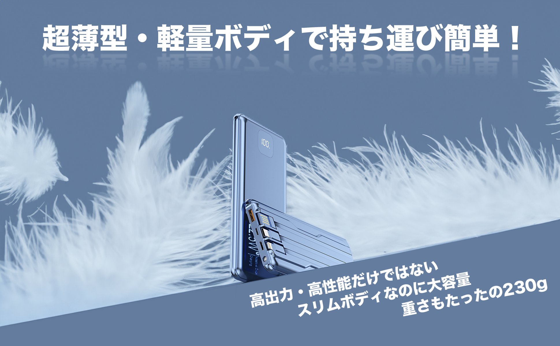 高出力・高性能だけではなくシンプルな高級感がある一目惚れのモバイルバッテリーです。本スマホ充電器は超大容量のバッテリーを搭載していても145*67*20mmの超薄型コンパクトサイズで、ポケットに収まり、片手で簡単に掴むことのできるスリムさを実現できました。重さもたったの230gとスマホ1台分程度とかなり軽量で、ポーチやカバンに入れて持ち歩いても邪魔にならず、旅行や充電環境のないアウトドアシーンに持ち出すことも楽しくなります。また、コンパクトボディは片手持ちが苦にならず、エッジをゆるやかにラウンドさせたフォルムも高いホールド感を生み出してくれます。