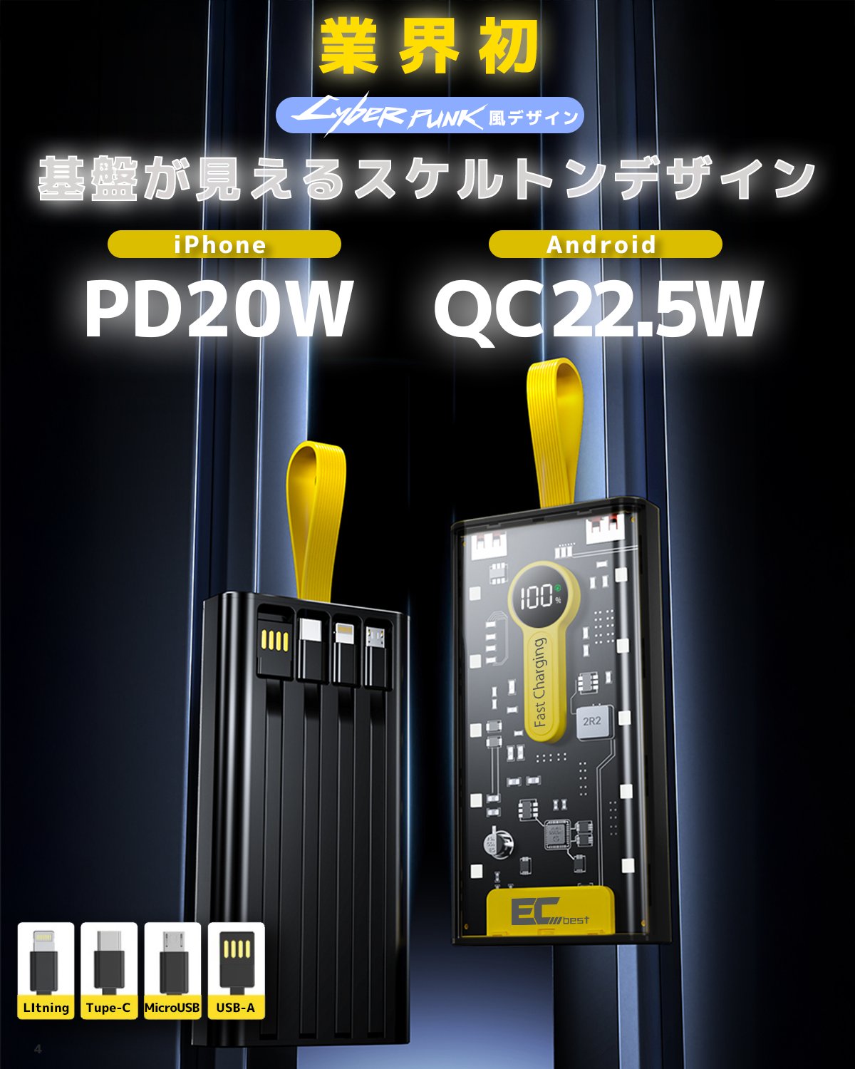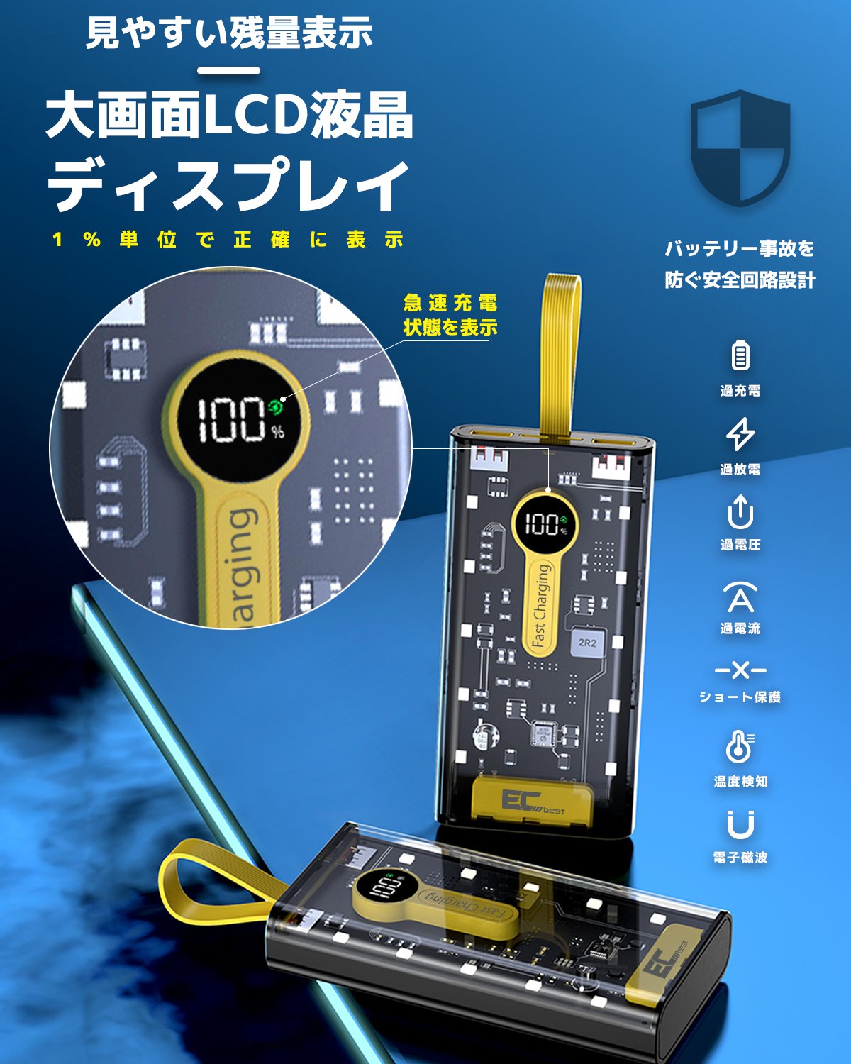 モバイルバッテリー 大容量 22.5W対応 PD20W 急速充電 真20,000mAh PL保険付き 4本ケーブル内蔵 6台同時充電 技術適合品 LCD電量残量表示 iPad/iPhone/Android全種機器対応 パススルー可 コンパクト&軽量 機内持ち込み可能 安全設計&回路保護