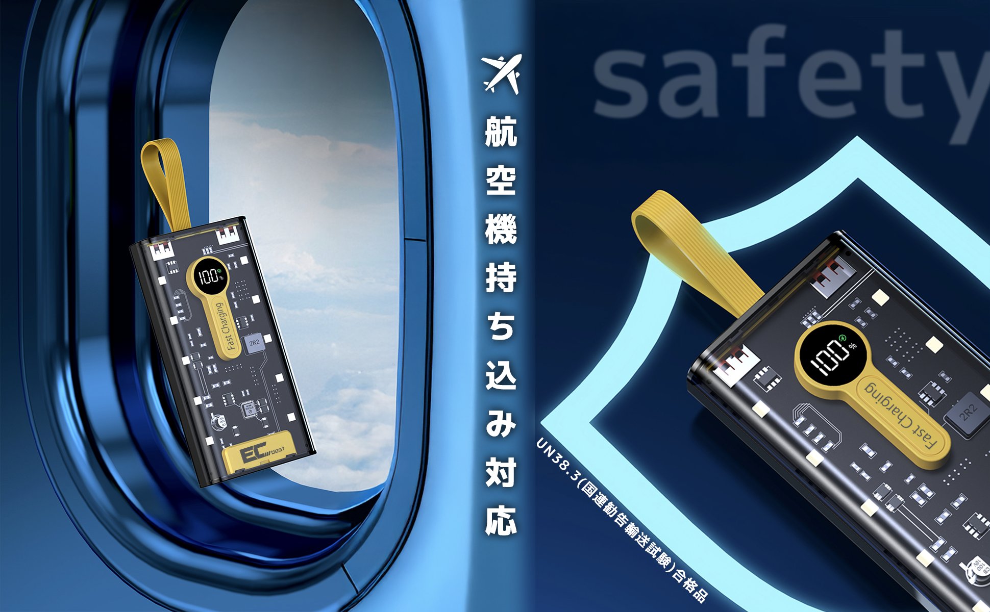 本製品は日本国内のJIS C 62133の基準をクリアした商品になります。長期間安心、安全にご使用いただけます。 過充電・過放電・過電圧・過電流防止機能およびショート保護機能と温度検知機能、電子磁波保護の7つの保護機能など安心の回路設計を備えました。モバイルバッテリー本体の熱発生を抑えて、熱伝導をしにくくする発熱抑制システム、充放電中に危険な状態にならないよう充電ポートSmart ICが内蔵されており、充電が完了したら自動でストップ、電池の過充電を防止、スマホバッテリー寿命を長持ちさせることができます。本製品もUN38.3(国連勧告輸送試験)合格品で、機内持ち込みすることも可能です。(航空会社によって規制の内容が異なる場合があります。)