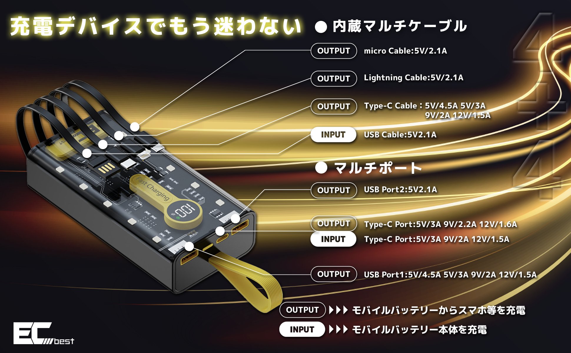 入力には、USB-Type-Aケーブル*1本、Type-Cポート*1個、Microケーブル*1本が内蔵されます。出力にはMicro、Type-C、Lightning、3規格出力ケーブルとUSB Type-Aポートが2個内蔵され、6台の設備を同時に充電する事ができます。ほとんどの機種の対応ができる事で、充電する端末専用のケーブルを持ち歩く必要がなくなります。Micro USBケーブルが付属し、モバイルバッテリー本体の充電はもちろん、Micro USBコネクター搭載スマートフォンも充電可能です。コンセント不要で充電できるので、様々なシーンで活用が可能です。いつでもどこでも気軽に持ち運べて、この一台で充電が困る事もないです。