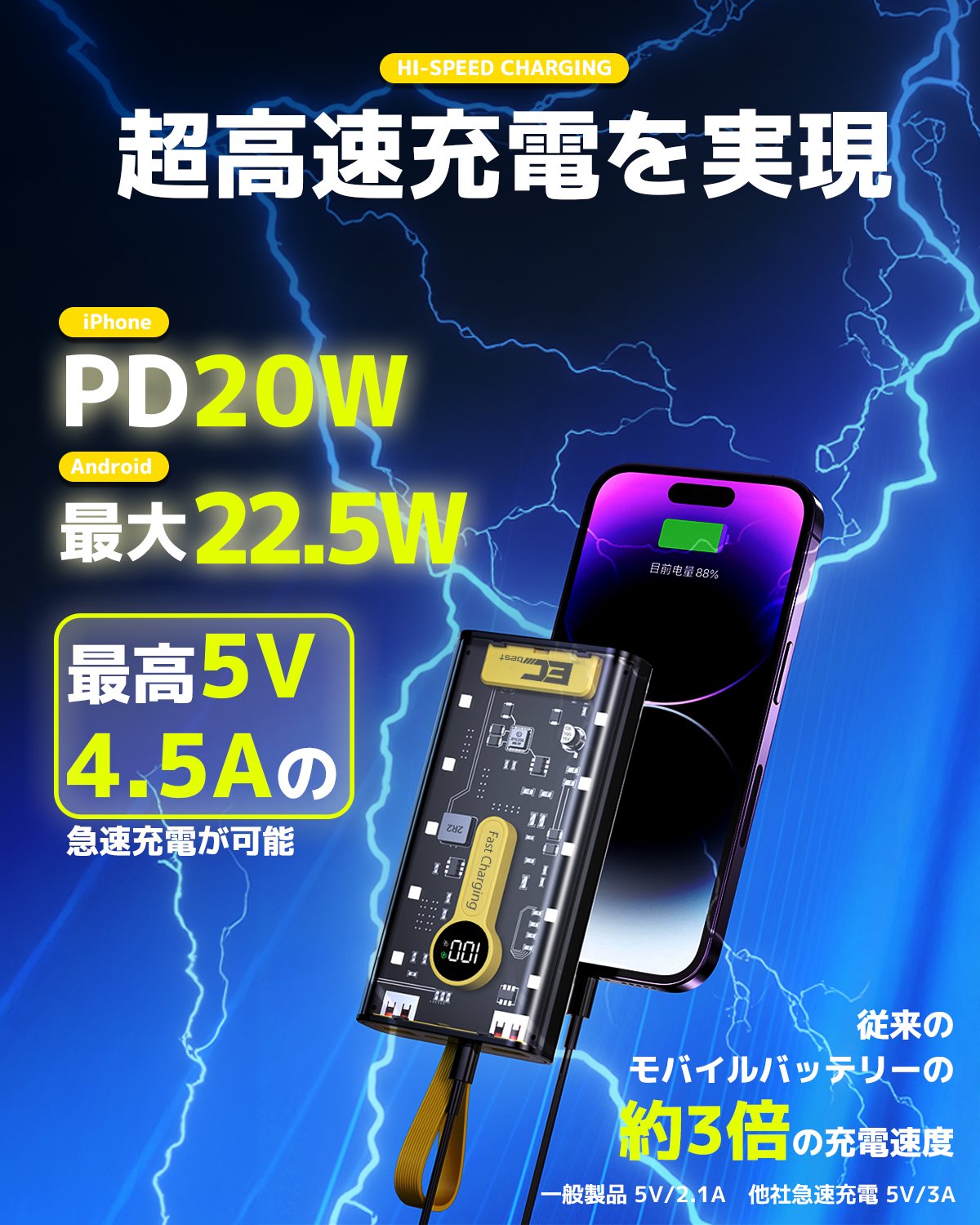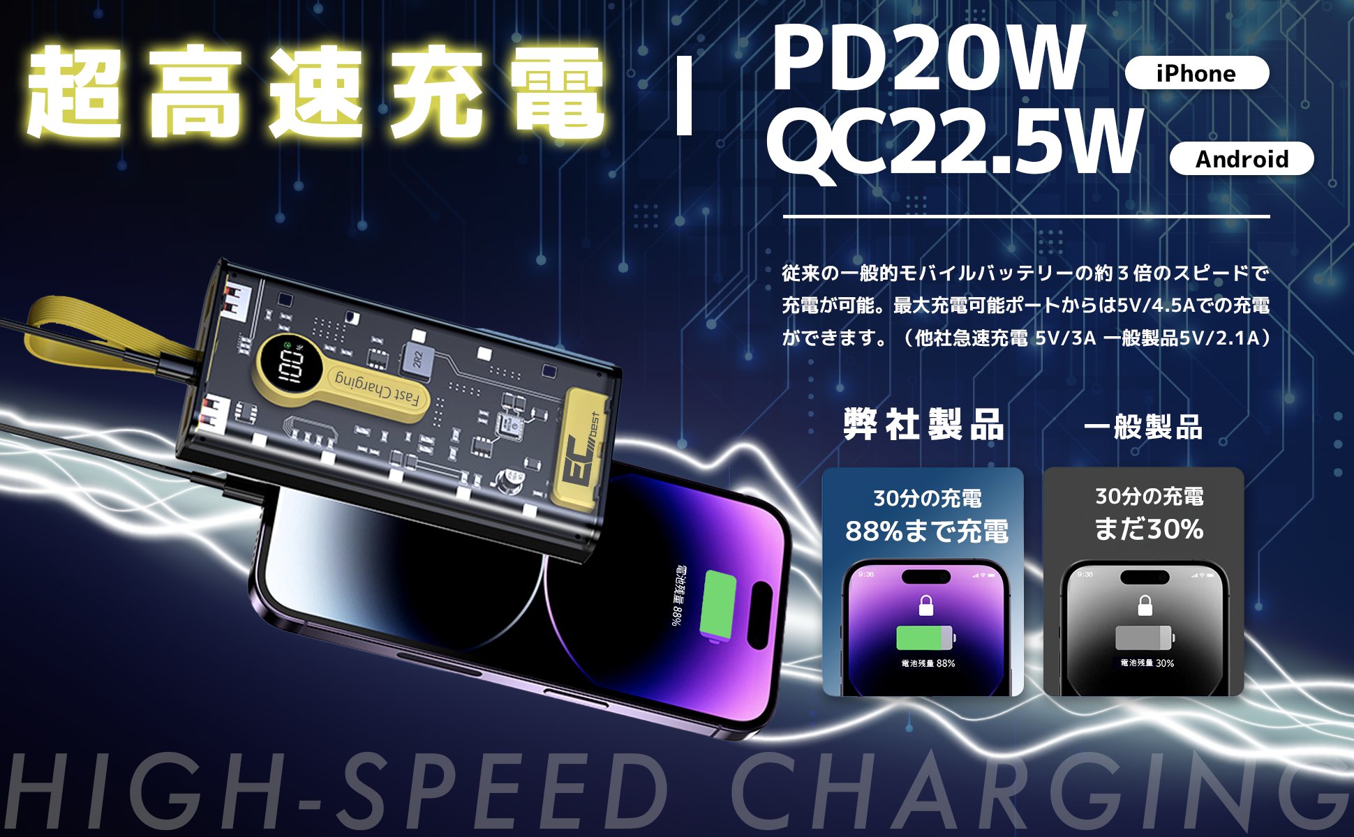 弊社製品はすべてアメリカのQualcomm社が開発した、スマートフォンやタブレットを急速で充電できるシステムを採用、Quick Chargeに対応したスマートフォンであれば、普通のモバイルバッテリー1.0Aと通常の急速充電2.0Aやと比較しても遥かに早い、ご利用のデバイスにより最大5V/4.5Aで充電が可能です。また、急速充電技術に対応により、最大22.5W出力のUSB Type-Cケーブルと最大22.5W出力Type-Cポート、最大10.5W出力のUSB Type-Aポートを備え、全てのApple製スマートフォンやタブレット、ほとんどのAndroid機器に対して急速充電することができます。iPhone12の場合わずか40分で86%まで充電可能で、Huawei Mate40の場合は30分で65%まで充電する事ができます