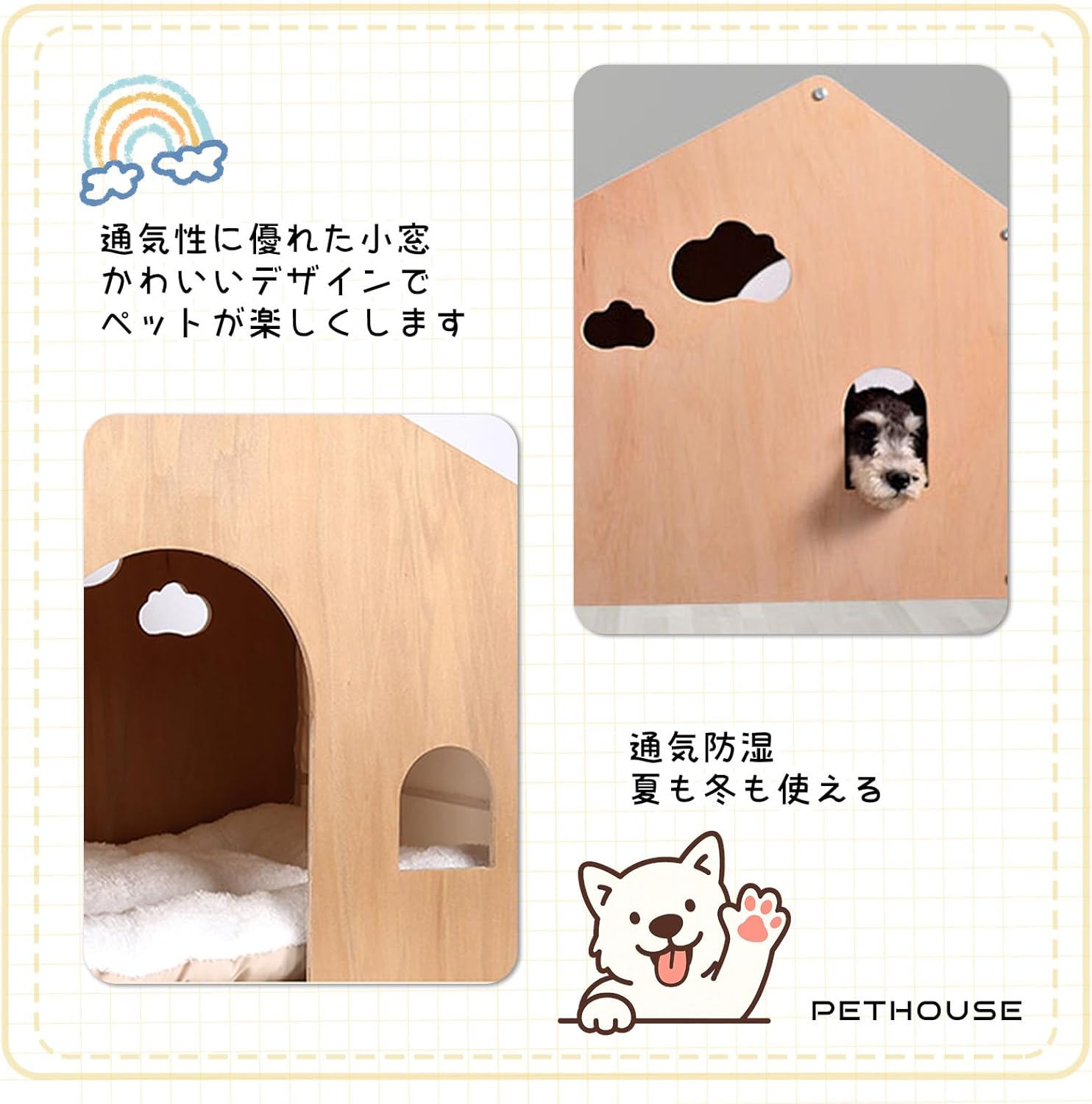 ペットハウス 木製 ペットベッド 犬小屋 キャットハウス 小型犬 猫 クッション付き 洗える 組み立て簡単 52幅×47奥行き×50高さcm 換気 通気性 防湿性 多層無垢木材 かわいい おしゃれ
